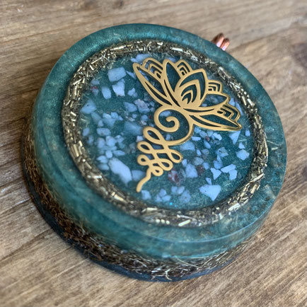 De orgonite heeft een doorsnede van ongeveer 5,5 cm, is 1,5 cm hoog en weegt 65 gram.